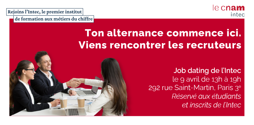 Conseils et points clés pour réussir les épreuves7 avril 202621 avril 2026Webinaire - WebconférenceAfin de vous accompagner au mieux dans la préparation de vos examens, l’Intec organise une série de webinaires dédiés aux conseils et aux points clés pour réussir les épreuves du DGC/DCG et du DSGC/DSCG. - Job Dating de l'Intec - 20269 avril 2026Vous êtes inscrits à l'Intec et recherchez un contrat d'apprentissage dans le cadre de vos études ?Vous êtes un (e) professionnel (le) de la comptabilité et de la gestion à la recherche de votre futur alternant(e) ?